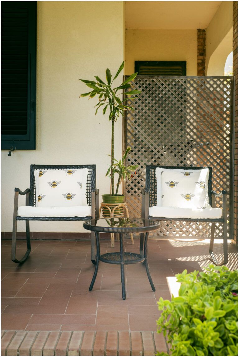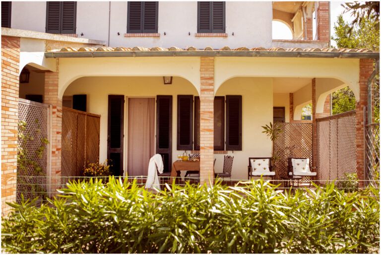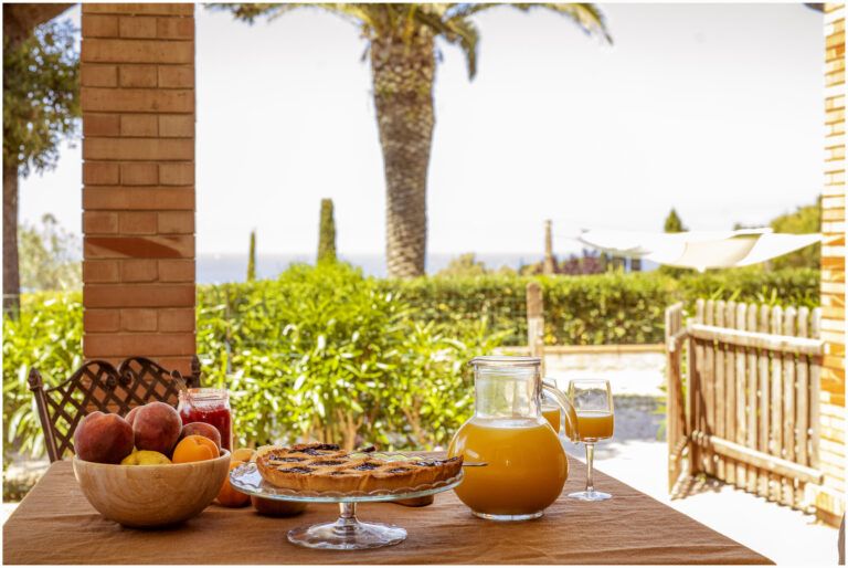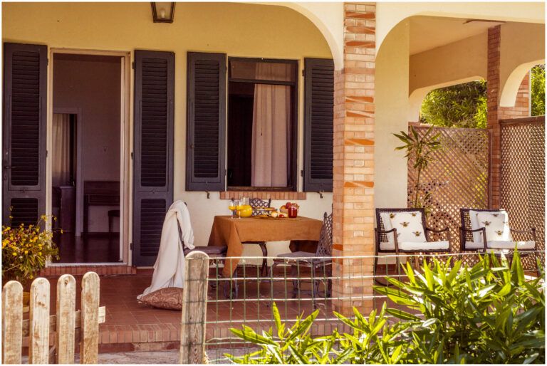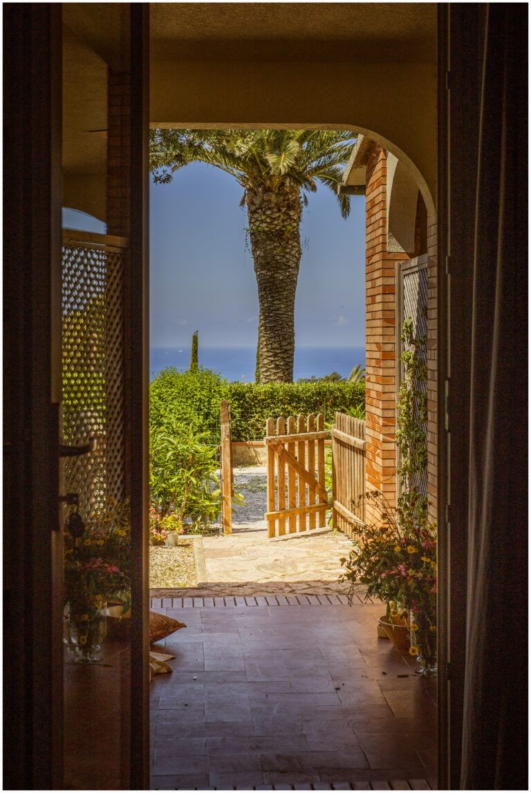 Porzione privata di portico attrezzato con tavolo e divanetto, ingresso indipendente. Vista mare